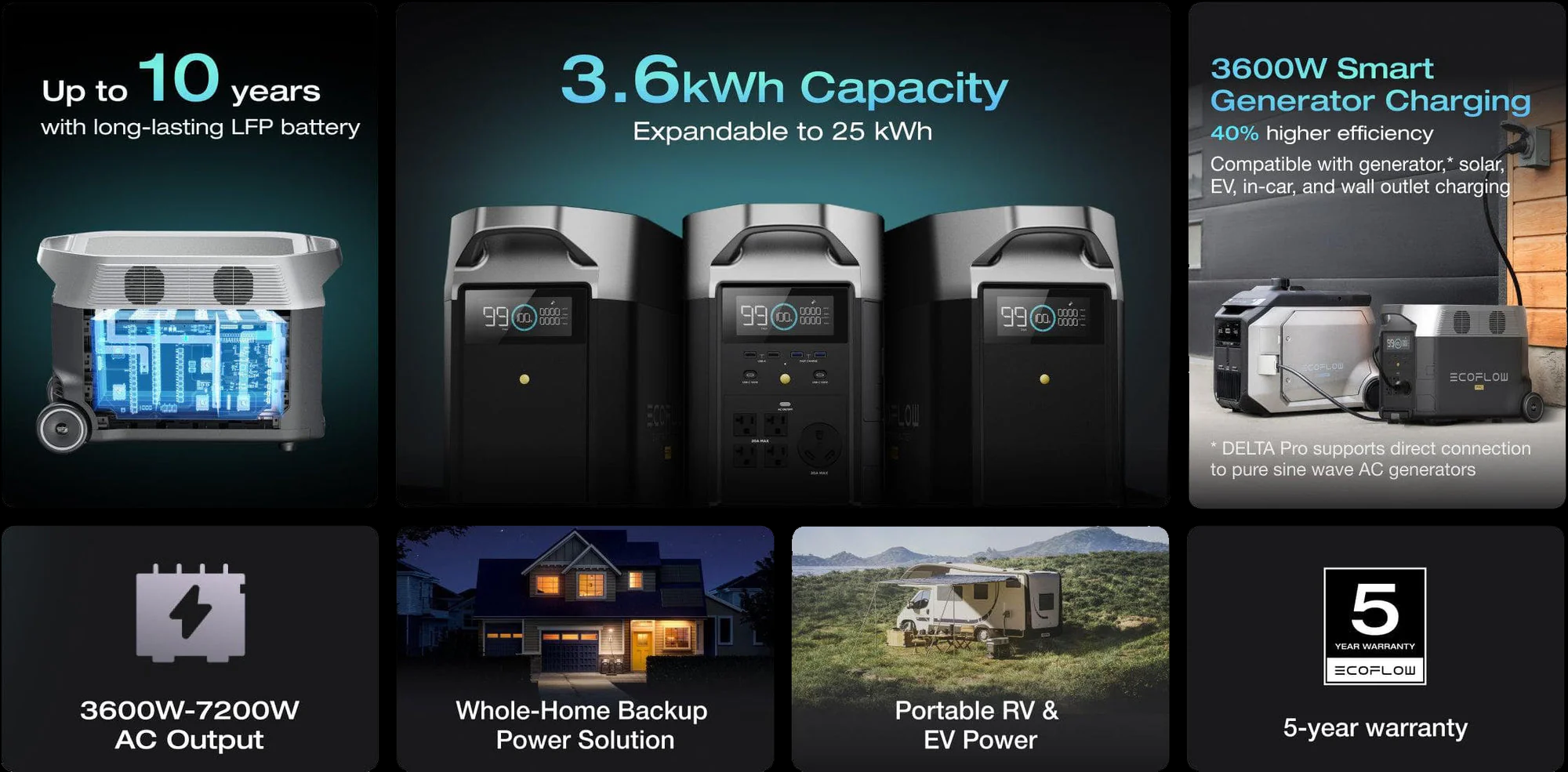 EF ECOFLOW Portable Power Station 3600Wh DELTA Pro, 2.7H to Full Charge, 5 AC Outlets, 3600W, 120V Lifepo4 Power Station with Expandable Capacity, Solar Generator for Home Use, Blackout, RV